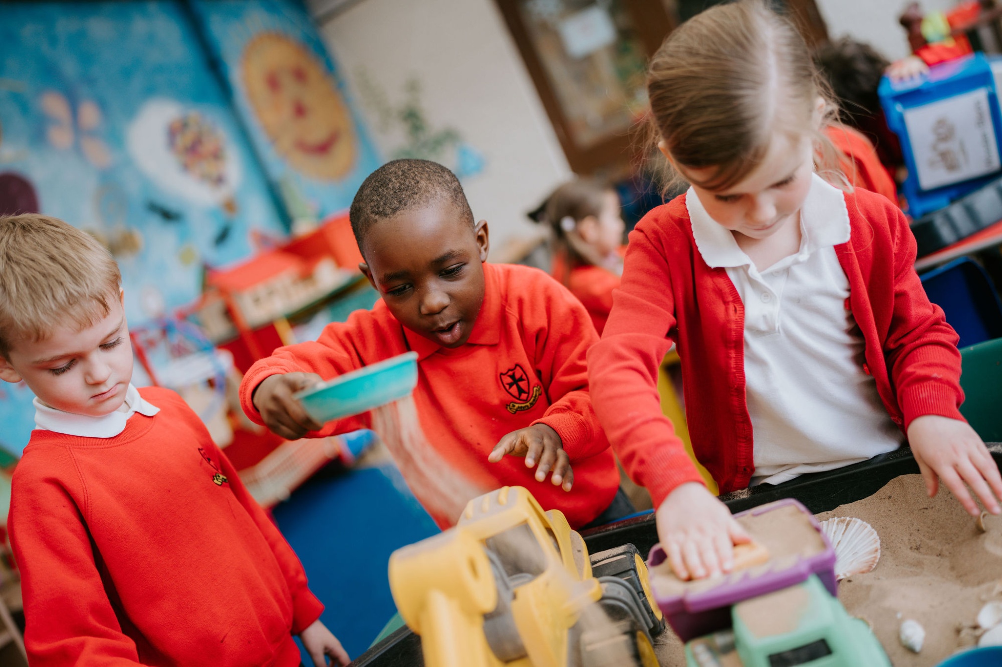 The importance of securing positive relationships with children and their families begins before the children start in our early years provision. There is a full transition programme for every child that involves a visit into school, parents’ meetings and visits into nurseries.  The transition programme is developed to meet the needs of individual children to ensure positive attachments are made with staff across the early years provision. This approach supports children’s and family’s wellbeing and enables the children to settle quickly within the provision.